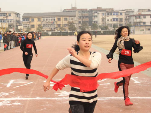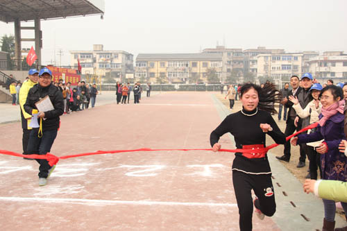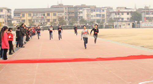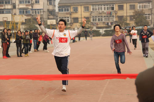 近了,更近了,王宏文的追跑拉近了兩個人的距離,劉梓軒從場下拉拉隊的喊聲里似乎感覺到情況不妙,只見他閉起雙眼,高臺雙腿,更加賣力的奔跑。就在大家猜測此次比賽到底誰是冠軍的時候,沒想到劉梓軒和王宏文竟一同闖過了紅線,成績并列第一。比賽結束,兩位領隊熱情的擁抱,這是本次活動最讓人意想不到的一幕,場下的歡呼聲表達了大家的驚喜。